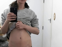 Brunette ladyboy in full body pantyhose jerks off solo in